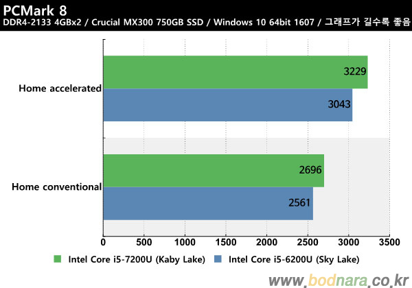 실제 PC 사용 환경을 고려한 PCMark 8 Home 테스트 결과에서도 OpenCL 가속을 사용했을 때와 하지 않았을 때 모두 프로세서 클럭이 올라간 코어 i5-7200U의 점수가 높아진 것으로 나온다. 6세대 스카이레이크를 기준으로 보면 한 등급 위의 제품(코어 i5-6300U, 2.4@3GHz)가 되었다고 생각해도 무방하지 않을까?