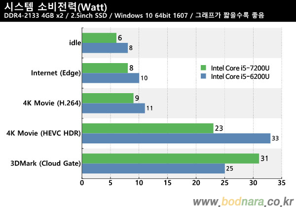 시스템 소비 전력 비교는 두 테스트 시스템의 스펙과 부품 구성에 차이가 있기 때문에 정확한 비교는 어렵고 대략적인 참고 용도로만 봐주기 바란다. 가장 눈에 띄는 것은 인텔이 약속한 것처럼 새로운 미디어 엔진의 개선된 전력 효율성이 HEVC 10-bit HDR 동영상 재생에서 그 효과를 보이고 있다는 점이다. 반면 3DMark에서는 카비레이크 시스템의 소비 전력이 훨씬 높았는데, 프로세서 클럭이 증가함에 따라 최대 클럭(최대 부하 성능)에서의 소비 전력은 증가했을 가능성도 있다.