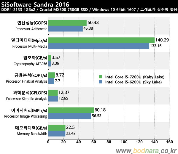 Sandra 2016으로 코어 i5-7200U의 성능을 살펴봐도 CPU 클럭 증가에 따른 수준의 성능 향상을 보여주고 있는 것으로 나온다. 메모리 대역폭은 두 테스트 시스템 모두 듀얼채널 DDR4-2133MHz로 구성해 차이가 거의 없는 것으로 나타났다.