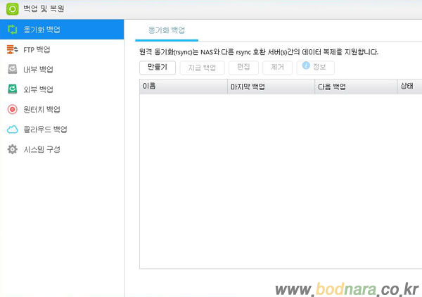 '동기화 백업'은 다른 아수스토어 NAS나 Rsync 서버에 백업할 수 있다. 그렇게 백업한 데이터는 복원용으로 사용 가능하므로 데이터를 더 안전하게 보존하고 싶을 때 유용하다. 'FTP 백업'은 FTP 서버를 이용한다는 차이점이 있다.