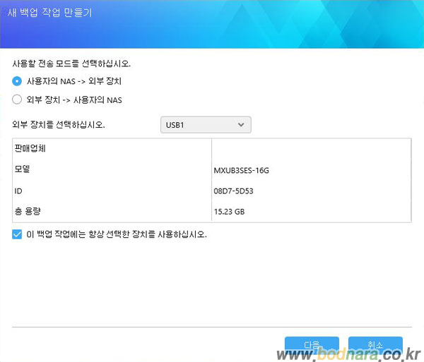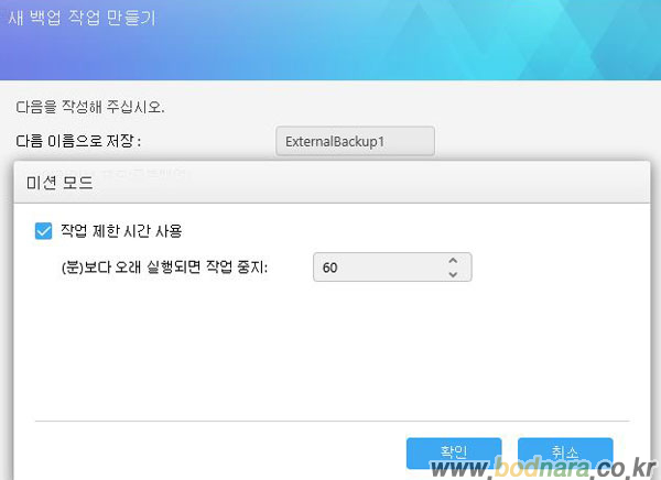 한편 백업 진행 중에는 '미션 모드'를 설정할 수 있는데 지정한 시간보다 백업이 오래 걸리면 작업을 중단하는 기능이다. 최소 5분에서 최대 1,440분(24시간) 내에서 설정 가능하다. 무언가 오류가 생겨서 백업이 제대로 진행 되지 않을 때 시간만 잡아먹는 사태를 막아주므로 도움 된다.