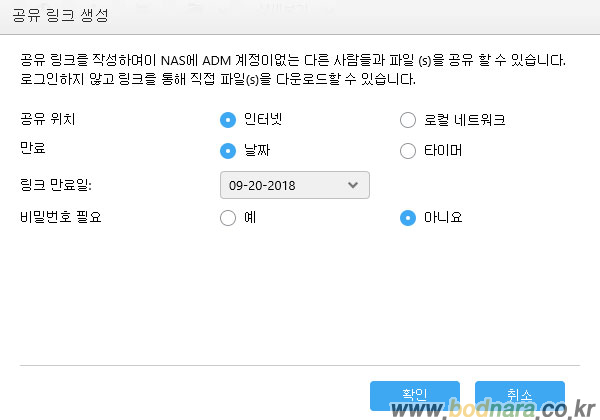 공유 링크 생성 창이 뜨면 인터넷이나 로컬 네트워크 중 한 가지로 파일 링크를 만들 수 있다. '만료'는 링크를 사용할 수 있는 만료 기한을 의미하며 날짜로 년/월/일, 타이머로 최장 31일 23시간까지 설정 가능하다. 보안을 위해 비밀번호를 추가할 수도 있다.