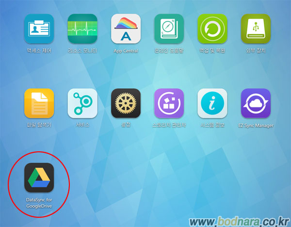 원하는 앱을 설치하고 나면 ADM 3.2 기본 화면 아래에 앱 아이콘이 생성 되고 그것을 선택하면 실행 된다. 구글 드라이브 데이터싱크 앱을 직접 설치해보았는데 외부 서비스와 연동하는 방식이어서 미리 해당 서비스에 가입하고 계정을 만들어둬야 사용 가능하다.