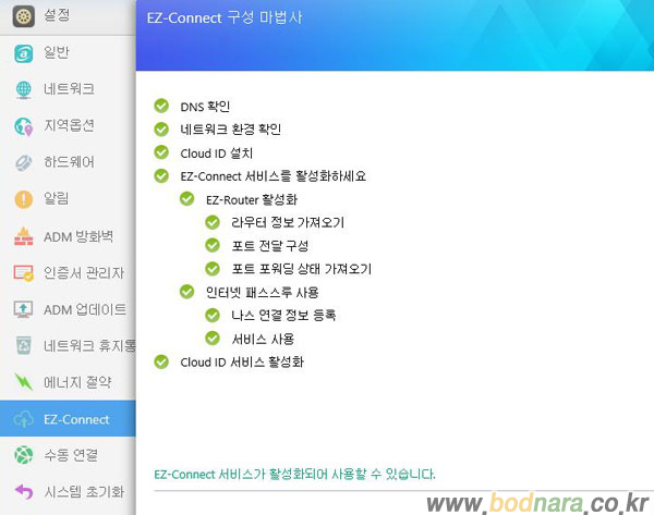 ADM 3.2 기본 화면에서 '설정'을 선택하면 하위 항목에 보이는데 거기에서 서비스를 활성화하면 자동으로 구성 마법사가 실행 된다. 아수스토어 아이디로 접속한 상태가 아니면 실행 되지 않으므로 미리 접속해야 한다.
