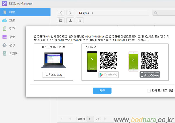 우측에는 '모바일 앱' QR 코드가 보이는데 이를 스마트폰이나 태블릿 카메라로 스캔하면 간편하게 구글 플레이와 애플 앱스토어에서 AiData 앱을 다운로드할 수 있다. AiData 앱을 사용하면 모바일 기기로 이지싱크 파일에 접근하여 살펴볼 수 있고 사진이나 동영상, 음원 파일은 앱 내에서 재생 가능하다.