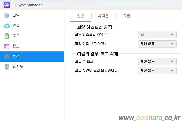 ADM 3.2 이지싱크 매니저에서는 동기화 된 파일 목록과 PC 연결 기록, 로그, 파일과 디스크 정보를 확인할 수 있다. 설정 항목에서는 파일 히스토리와 로그를 얼마나 어느 정도 보관할지 지정하고 설정 기한이 지난 파일을 언제 휴지통으로 보내서 삭제할지 결정할 수 있다.