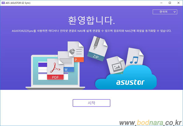 PC용 이지싱크 소프트웨어를 설치한 다음 실행하면 기본 화면이 보이는데 '시작'을 누르면 아수스토어 NAS를 연결하는 설정 단계가 나온다.
