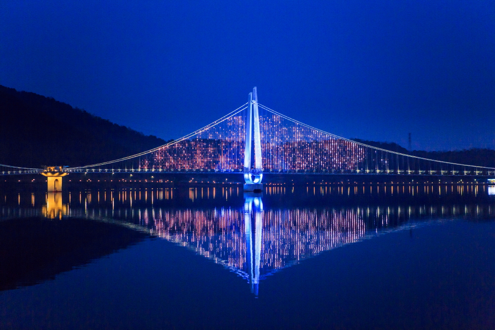 밤이 되면 다리는 또 다른 매력으로 빛난다. 가로 300m, 세로 25m의 출렁다리 행어면이 거대한 스크린이 되어 반짝이는 빛의 향연을 펼친다. 별빛이 호수 위로 쏟아져 내리는 것 같은 모습에 감탄사가 절로 터져 나온다. 호수에 반영된 완벽한 데칼코마니는 인간과 자연이 만들어낸 한 폭의 예술 작품이나 다름없다.