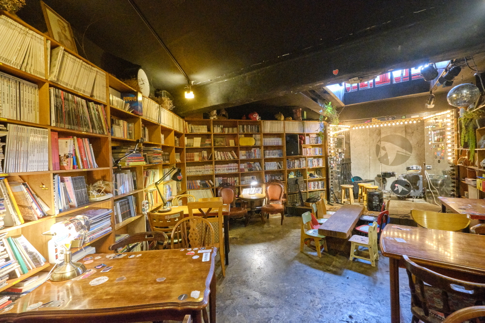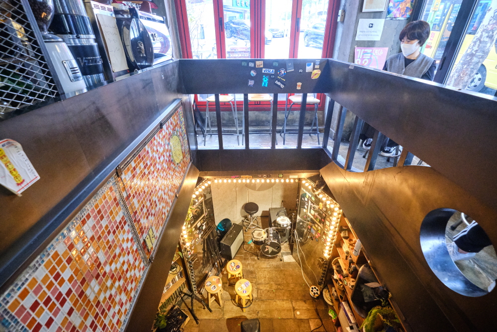 빨간 문을 열고 들어가니 어둑어둑한 분위기 속 낭만이 가득 흐른다. 제비다방은 뭐랄까, 낮이나 밤이나 아지트 같은 공간이다. 낮에는 북카페로 운영되고, 밤에는 공연장 겸 바로 변신한다.