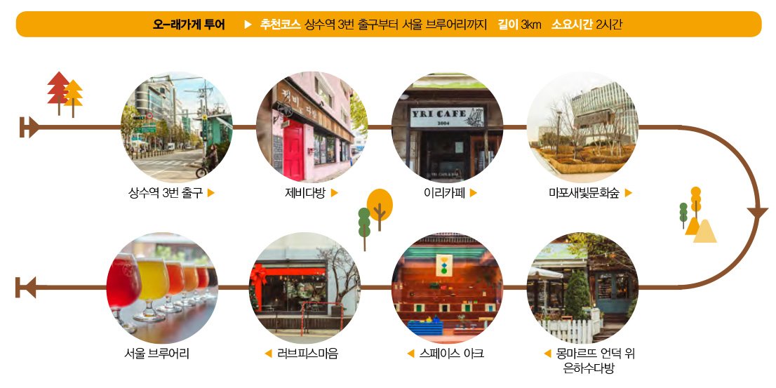 상수역 3번 출구 → 제비다방 → 이리카페 → 마포새빛문화숲 → 몽마르뜨 언덕 위 은하수다방 → 스페이스 아크 → 러브피스마음 → 서울 브루어리