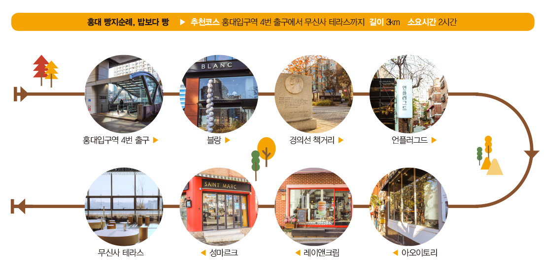 홍대입구역 4번 출구 → 블랑 → 경의선 책거리 → 언플러그드 → 아오이토리 → 레이앤크림 → 성마르크 → 무신사 테라스