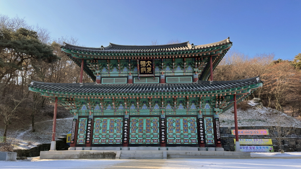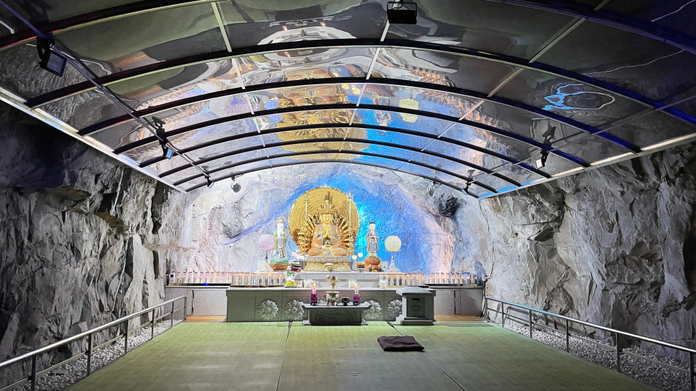 대웅전 뒤편에 조성된 동굴 법당은 비밀스러운 공간에 들어서는 느낌이다. 석회를 채굴하던 지하 광산에 만든 법당은 화려한 조명과 함께 한가운데에 좌정한 부처상을 모셔 놓았다. 동굴 안은 똑똑 떨어지는 물방울 소리 외에 모든 소음이 차단된 것 같은 고요함이 흐른다. 마치 다른 세상에 온 듯한 기분이다. 동굴 특성 상 여름에는 시원하고 겨울에는 따스함이 느껴지는데, 침묵 속에서 홀로 기도하고 수련하기에 이만한 곳도 없어 보인다.