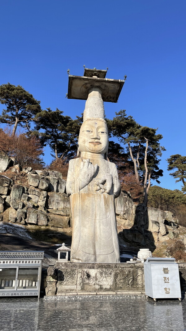 관촉사는 우리나라에서 가장 큰 석불을 모신 사찰이다. 논산 은진미륵이라 불리는 석조미륵보살입상은 높이가 18m에 이를 정도로 거대하며 동양 최대의 석불로 꼽힌다. 또한 국보 제323호로 지정되어 있다. 고려 광종 18년에 혜명대사가 건립한 것으로 전해지는 은진미륵은 보통의 미륵불과는 다른 모습이다. 자애로운 표정보다는 엄숙하고 심오한 분위기가 흐른다. 머리와 손을 강조한 표현양식과 두상 부분에 높게 세운 보개가 당시 시대상을 반영하는 듯 독특하다.