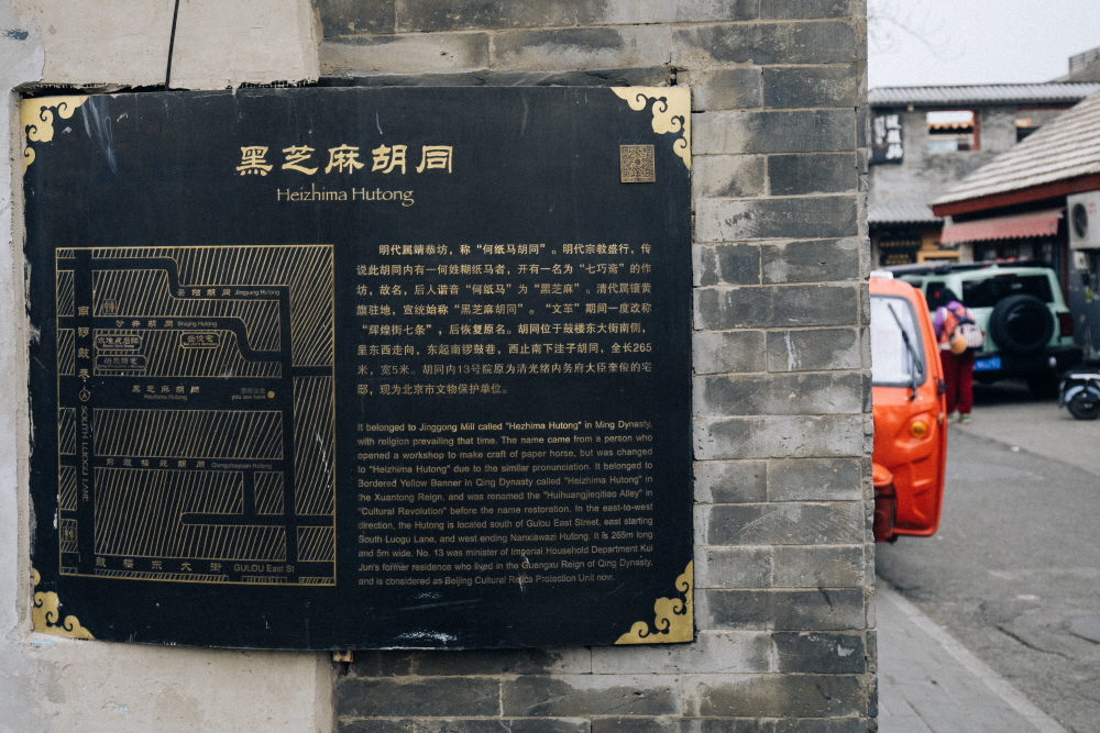 베이징에서 가장 유명한 후퉁을 꼽으라면 난뤄구샹(南锣鼓巷)이다. 이곳은 베이징올림픽 이후 문화거리로 변신해 여행객들로 북적인다. 좀 더 사람 사는 곳을 여행하고 싶다면 ‘헤이즈마 후퉁’을 추천한다. 난뤄구샹 후퉁과 연결되어 있어 함께 돌아보기 좋다. 사실 이곳은 허(何)씨 제사에 쓰는 즈마(纸马, 종이)를 만들던 골목이라 과거 ‘허즈마’라고 불렸는데, 그 발음이 검은깨를 뜻하는 헤이즈마(黑芝麻)와 비슷하다 해 붙여진 이름이다.